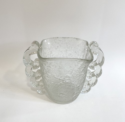 VASE à col carré en verre moulé pressé à panse givrée et à deux anses latérales à prises en enroulement.