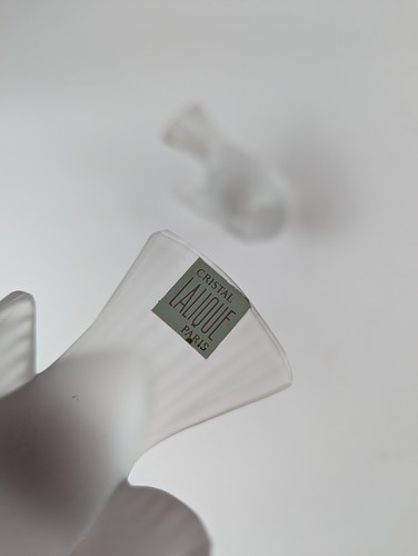 PAIRE D'OISEAUX en verre moulé pressé translucide. Signés à l'aiguille, une étiquette d'origine.