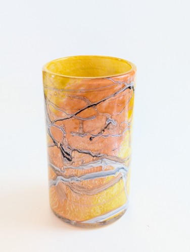 PETIT VASE rouleau, en verre soufflé teinté, pailleté et filé, signé et daté 2004.