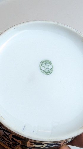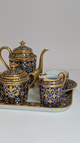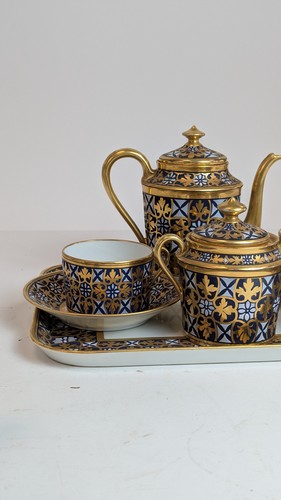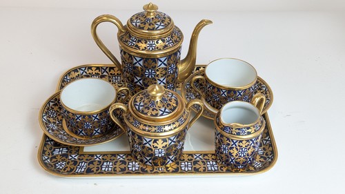 TÊTE-A-TÊTE en porcelaine de Limoges à décor de motifs géométriques et feuillagés bleu, blanc et or, comprenant un verseuse, un pot à lait, un sucrier couvert, paire de tasses et sous-tasses et un plateau rectangulaire.