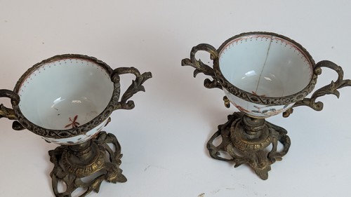 PAIRE DE PETITES CASSOLETTES à monture rocaille en bronze doré, la coupelle en porcelaine probablement Chine, pour la Compagnie des Indes, à décor d'oiseaux branchés.