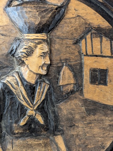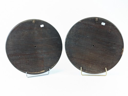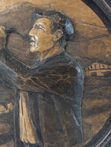 DEUX MEDAILLONS en bois sculpté à décor en bas-relief d'une femme basque porteuse d'eau et d'un paysan à sa gourde.