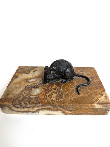 PRESSE-PAPIER représentant une souris en bronze patinée sur une base rectangulaire en marbre brèche.