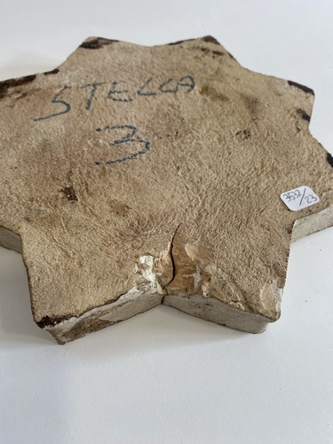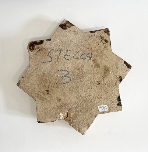 CARREAU de faïence en forme d'étoile à décor émaillé polychrome d'un nu masculin devant un paysage.