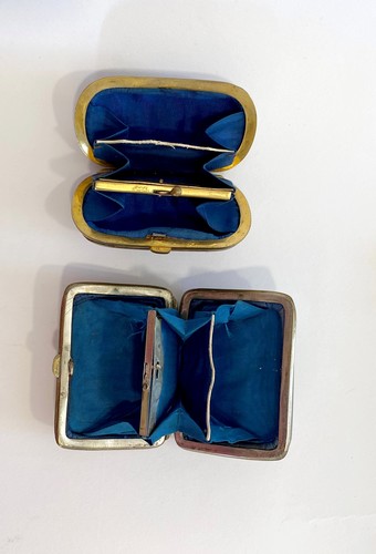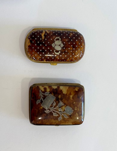 DEUX PETITS PORTE-LOUIS en corne piquée argent, l'un ovale à décor de médaillons sur fond d'étoiles, l'autre rectangulaire avec branche de rose et cartouche.