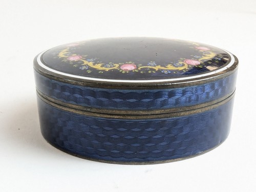 BOÎTE ronde en argent (935) à décor émaillé bleu guilloché avec guirlandes de fleurs sur le couvercle, intérieur doré.