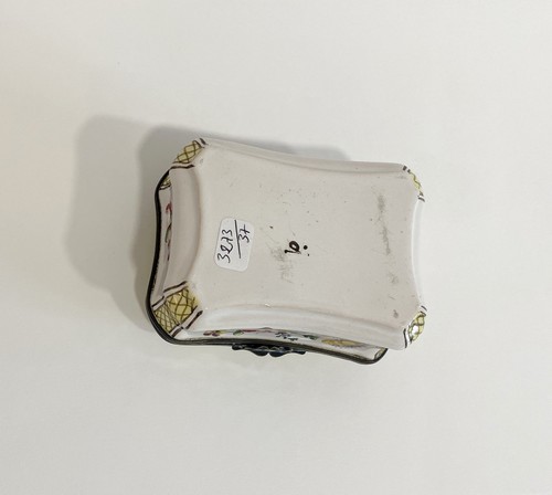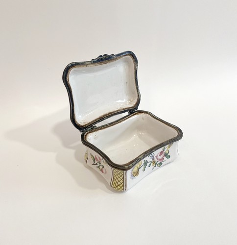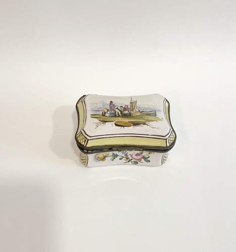 BOÎTE TABATIERE en faïence émaillée polychrome, de forme chantournée à décor d'une scène d'acostage sur le couvercle et bouquets de fleurs sur les côtés, bordures jaunes. Marque VP sous la base. Monture en métal.