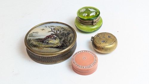 BOÎTE ronde dite à pralines, à couvercle bombé fixé sous verre d'une gravure de scène galante réhaussée d'aquarelle. (Diam. 8,5 cm)