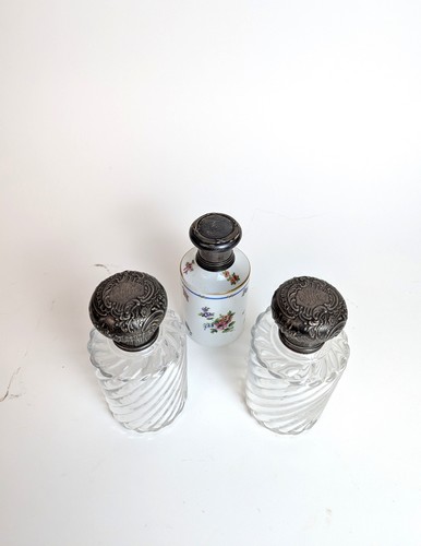 PAIRE DE FLACONS en cristal torsadé avec bouchon, monture et couvercle en argent (950) à décor rocaille monogrammé.
