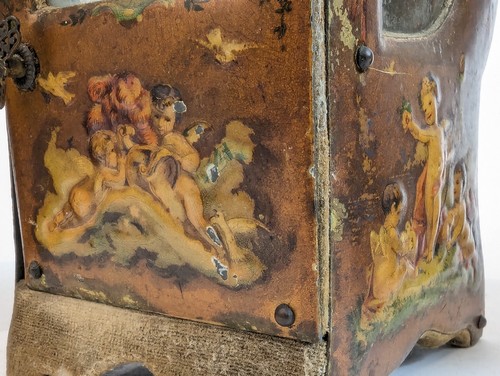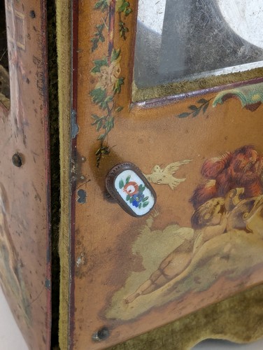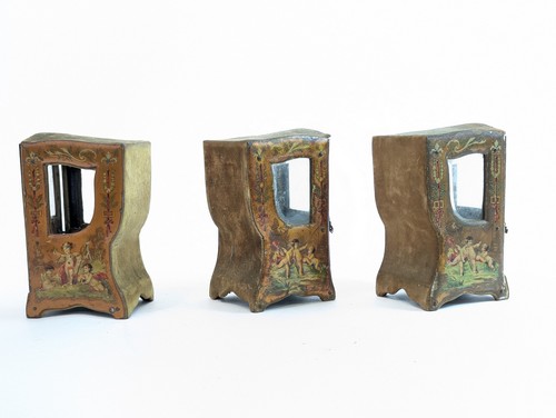 TROIS PETITES VITRINES en forme de chaise-à-porteur en verni européen à décor d'angelots.
