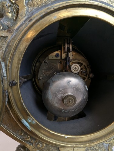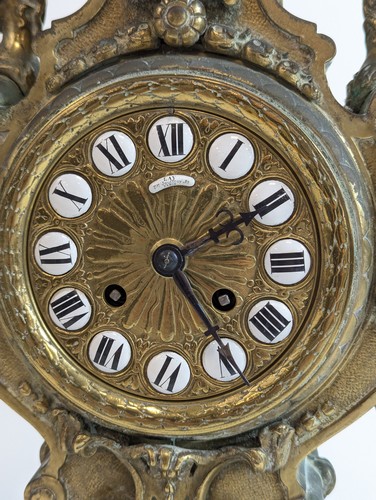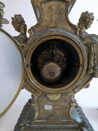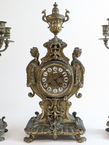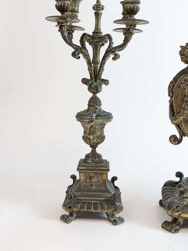 GARNITURE DE CHEMINÉE en bronze à décor éclétique rocaille, comprenant une pendule à cadran signé Lay passage Jouffroy à Paris (51 cm) et une paire de candélabre à cinq lumières dont un binet central couvert (55 cm)