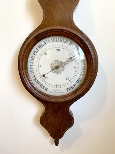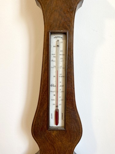 BAROMETRE-THERMOMETRE dans un cadre en acajou et placage d'acajou à filet de bois clair signé Leydecker à Paris.