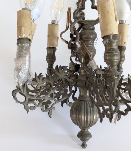 PETIT LUSTRE en bronze à sept bras de lumières sur goupilles. Fût balustre godronné.