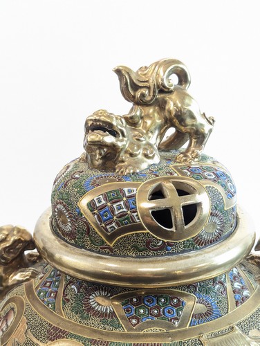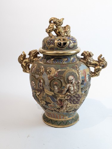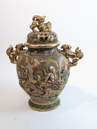 IMPORTANT BRULE PARFUM en gré émaillé et doré, à décor en bas relief de divinités dans un paysage stylisé. Anses et prise du couvercle en forme de lion bouddhique.