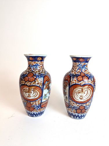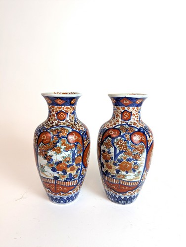 PAIRE DE VASES balustres en porcelaine à décor Imari de branchages fleuris et phénix dans des réserves en alternance sur fond de fleurette.