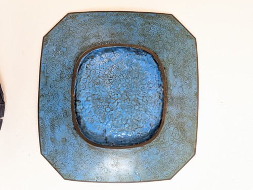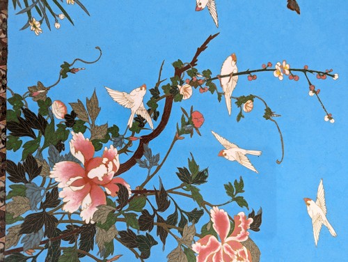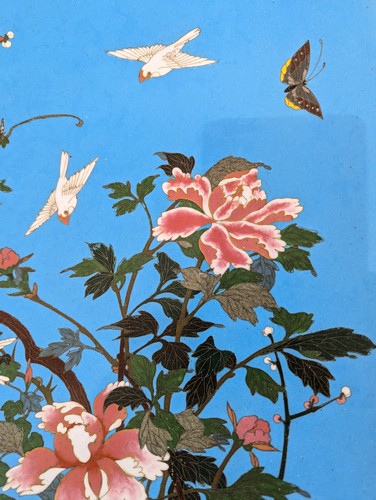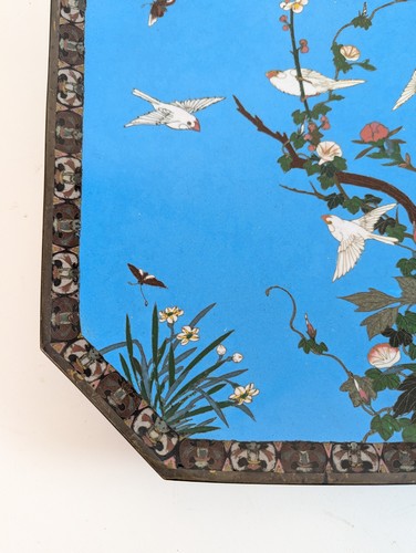 GRANDE COUPE rectangulaire à pans coupés en bronze et émaux cloisonnés à décor central de moineaux et papillons dans des branchages.