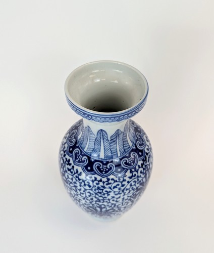 VASE balustre à col évasé en porcelaine émaillée polychrome à décor sur la panse de rinceaux et motifs floraux stylisés dans un encadrement de palmettes.