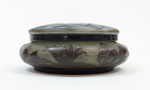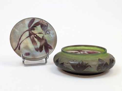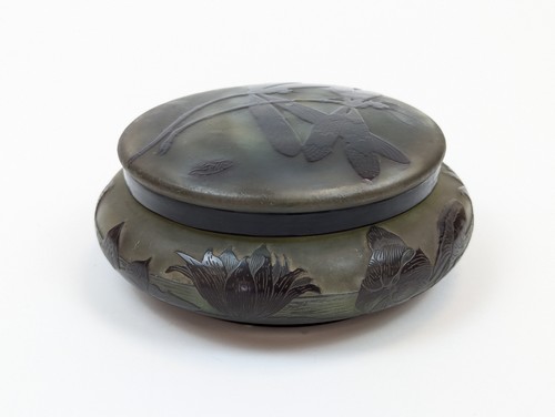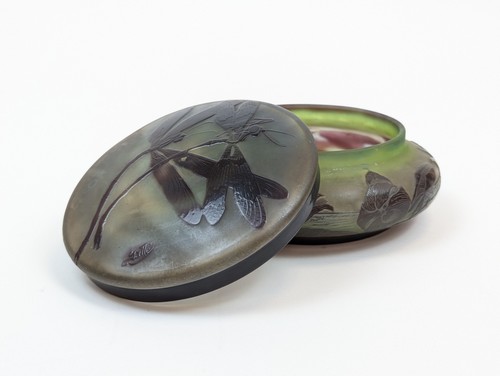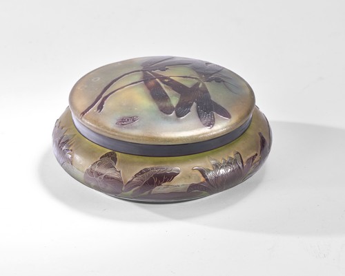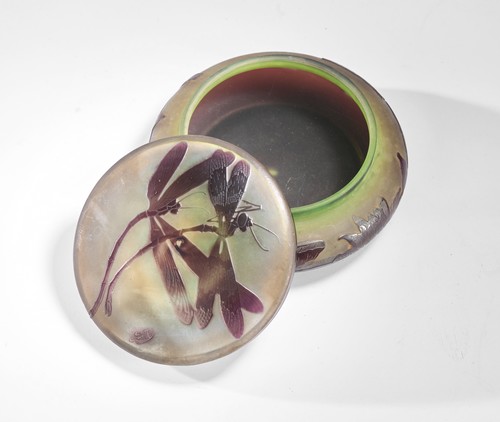 Epreuve en verre moulé soufflé à décor dégagé à l'acide marron de libellules volant au dessus d'un paysage lacustre sur fond vert.