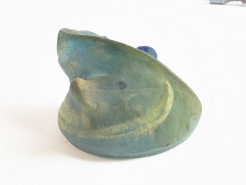 COUVERCLE circulaire ou PRESSE-PAPIER (?) en pâte de verre teinté bleu et vert représentant un scarabée sur de larges feuillages.