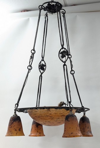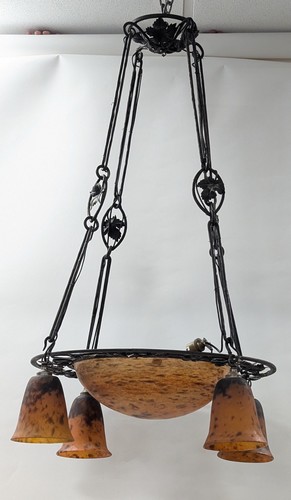 SUSPENSION à cinq lumières en fer forgé et martelé à décor de feuilles de vigne vierge en chute et orné d'une vasque et quatre tulipes en verre marmoréen orange. Chaque élément signé Daum Nancy à la pointe.
