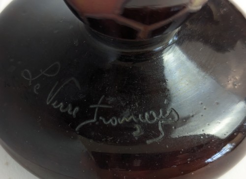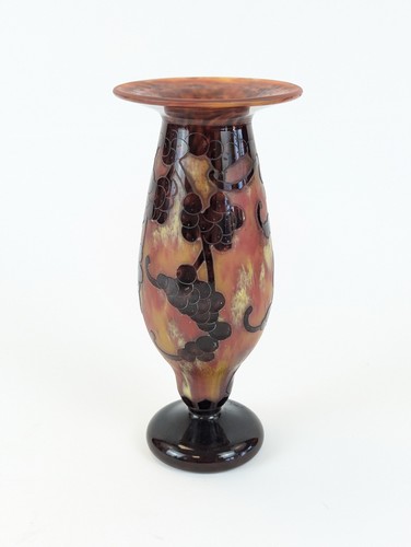VASE en verre multicouche rouge sur fond marmoréeen orange à décor dégagé à l'acide de grappes de fruits. Signé à l'aiguille.