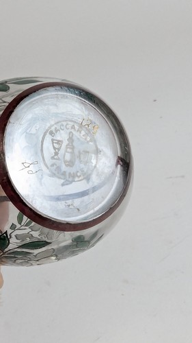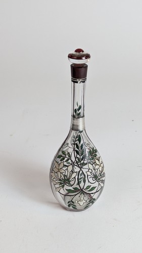 FLACON de parfum de forme ovoïde à col, en cristal émaillé poluchrome de fleurs et feuillages dans des rinceaux, col bagué en argent (restauration?), avec bouchon. Marqué.