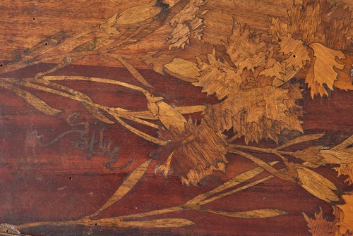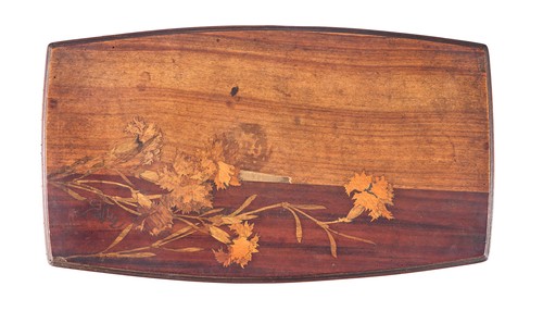 TABLE D'APPOINT en bois mouluré à plateau de forme légèrement convexe et à décor en marqueterie de semis de chardons. Les pieds moulurés et légèrement galbés réunis par une tablette d'entretoise à motifs de fleurs champêtres. Signée sur le plateau.