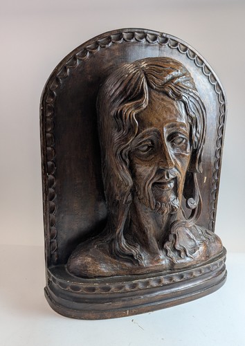 GRAND BUSTE en noyer mouluré et sculpté en ronde-bosse représentant le Christ de douleur à fond cintré.