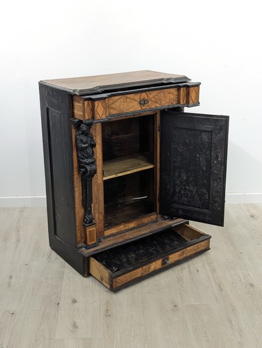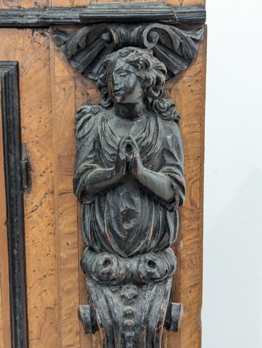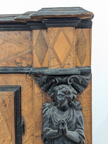 BUFFET RECTANGULAIRE en marqueterie et placage de noyer ouvrant à un tiroir en partie haute, une porte à caisson et un tiroir en partie basse. Les montants à ressauts ornés de termes d’ange en prière sur enroulements.
