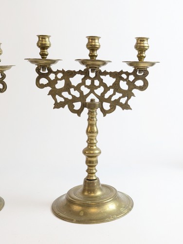 PAIRE DE BOUGEOIRS à trois lumières en bronze, supportés par un décor de rinceaux ajourés avec cervidés, sur fût balustre et base circulaire.
