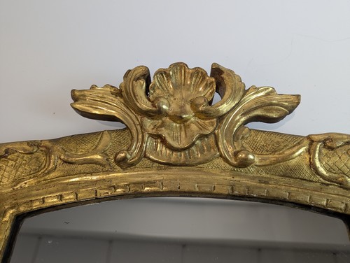 MIROIR cintré en partie haute dans un cadre en bois sculpté et doré à fronton feuillagé.