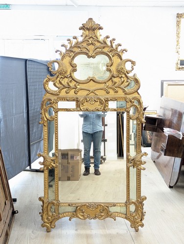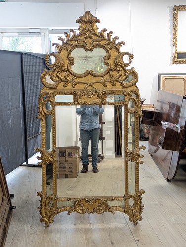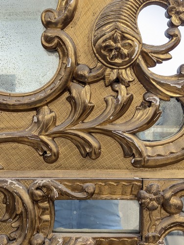 MIROIR rectangulaire biseauté dans un cadre à fronton en bois sculpté et doré à parecloses, à riche décor de rinceaux, coquilles et cornes d'abondance.