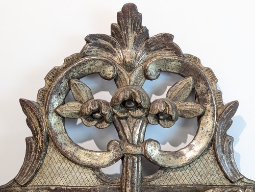MIROIR rectangulaire au mercure, dans un cadre en bois sculpté et doré à parecloses et fronton en rinceaux fleuris.
