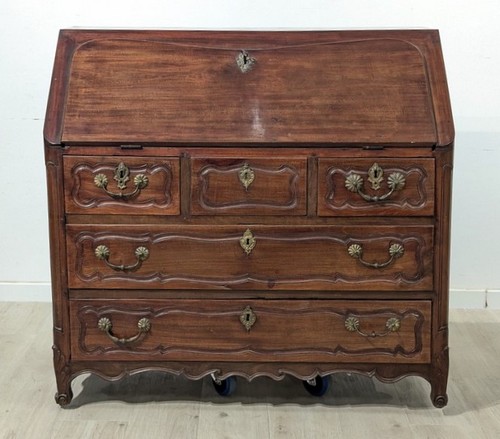 BUREAU DE PENTE en acajou et placage d’acajou ouvrant à un abattant, découvrant casiers et tiroirs et quatre tiroirs sur trois rangs en partie basse. Les montants droits moulurés, pieds à feuilles d’acanthes.