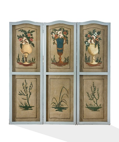 PARAVENT trois feuilles cintrées en partie haute et à décor peint sur toile de paysages lacustres dans des réserves soutenues de bouquets de fleurs et agrafes sur fond bleu ciel.