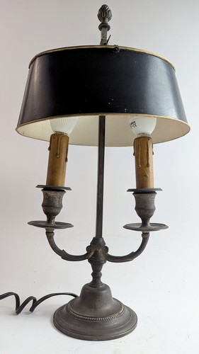 LAMPE BOUILLOTE en bronze argenté à deux lumières, abat-jour ovale ajustable en tôle à patine verte.
