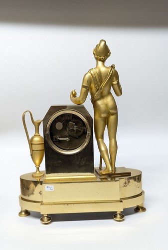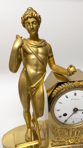 PENDULE en bronze doré et ciselé figurant un jeune berger tenant dans sa main gauche une pomme. Le cadran émaillé à chiffres romains signé Alexandre Destape à Paris et soutenu par un motif en applique de trompes, feuilles de laurier et lyre. Base ovale à ressaut central orné de feux et couronne de laurier. Pieds en doucine. Suspension...