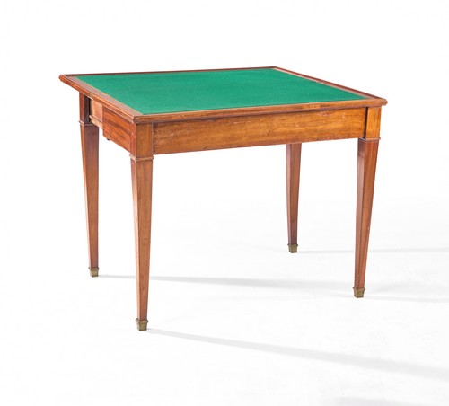 TABLE A JEU en placage d'acajou, à plateau abattant gainé de cuir rouge doré au fer et feutre vert à l'intérieur, pieds gaines.
