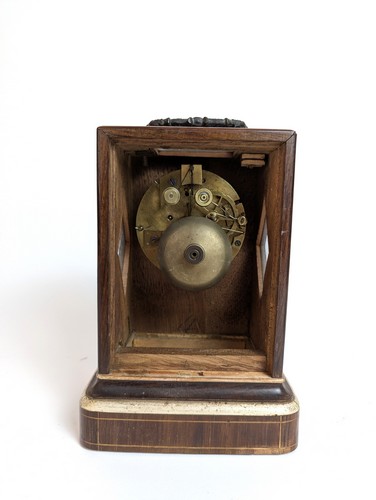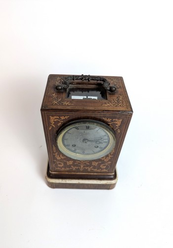 PENDULE BORNE en placage de palissandre et à décor marqueté de filets de bois clair en acanthes et motifs floraux.