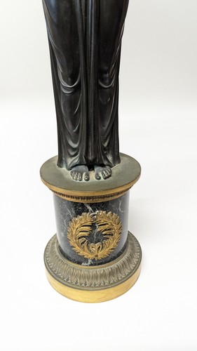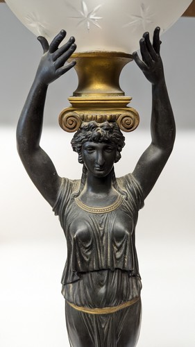 GRANDE LAMPE en bronze à deux patines représentant une vestale portant sur sa tête un globe en verre sur un chapiteau ionique, et reposant sur une base cylindrique en marbre vert-de-mer et signée sur le socle.