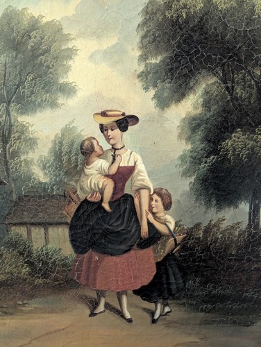 TRUMEAU avec miroir rectangulaire en partie basse et toile peinte en partie haute représentant une femme avec ses enfants dans un paysage avec chalet.