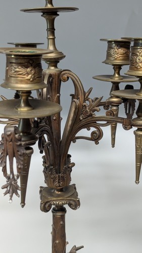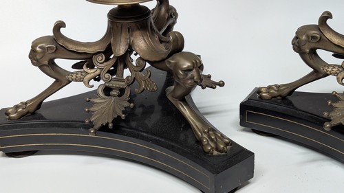 PAIRE DE CANDELABRES en bronze ciselé à six lumières à décor de palmettes. Le fût tripode à décor de mufles de lion. Base en marbre noir.
