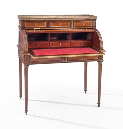 BUREAU A CYLINDRE en acajou, placage d'acajou et filets de laiton, ouvrant à trois tiroirs en gradin, un cylindre découvrant casiers, tiroirs et plateau coulissant gainé de feutre rouge et deux tiroirs en ceinture. Pieds fuselés cannelés de laiton. Dessus de marbre à galerie de laiton ajouré.