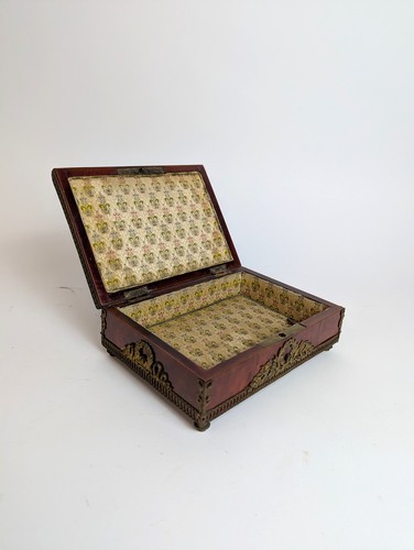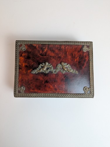 PETITE BOÎTE rectangulaire en acajou, placage d'acajou et en marqueterie d'écaille teintée et à monture en bronze et cuivre ciselé à décor en frise d'angelots, couronnes de laurier et médaillons laurés aux écoinçons.
