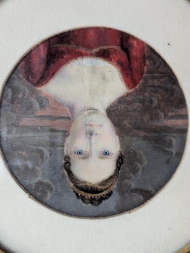 - Femme en robe Empire rouge sur fond de nuages, Epoque Empire. Diam. 5,2 cm
