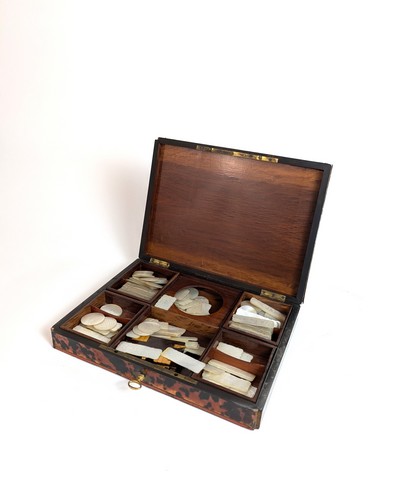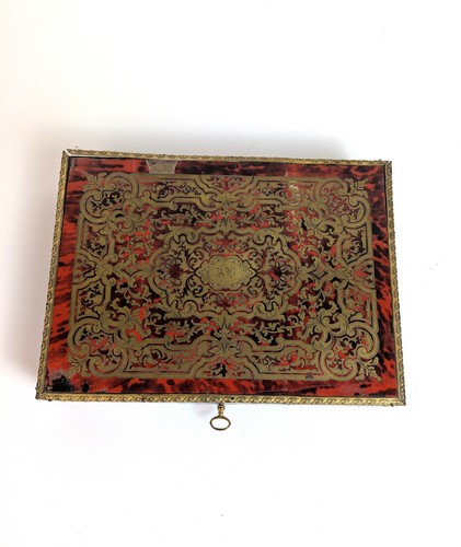 COFFRET A JETONS rectangulaire en placage et incrustations de laiton à l'imitation de la marqueterie Boulle à décor de rinceaux, arabesques et chiffré AB dans un médaillon central. L'abattant découvre plusieurs compartiments contenant des jetons de formes rectangulaire ou circulaires en nacre.