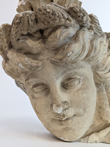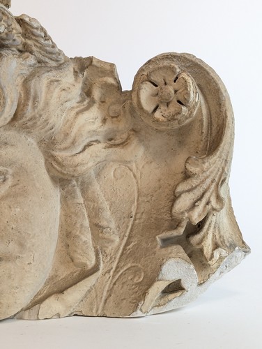 ÉLEMENT D’ORNEMENT d’architecture en staff figurant un mascaron avec rinceaux.