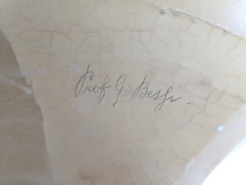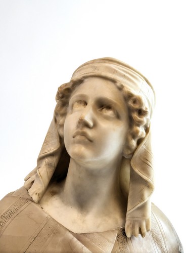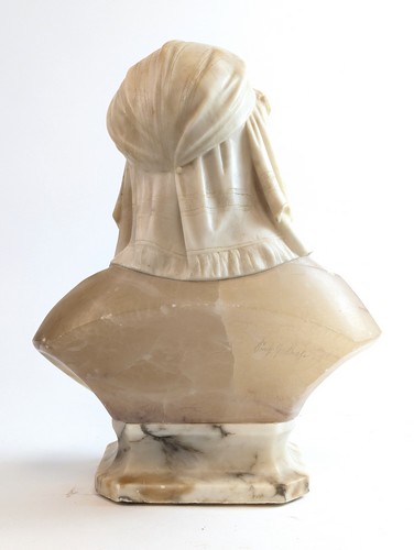 BUSTE en pierre reconstituée et albâtre sculpté figurant une jeune femme vêtue à l'antique.