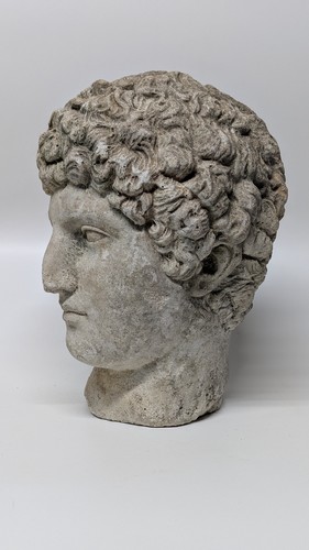 TÊTE sculptée en pierre reconstituée à décor d’après l’antique d’un éphèbe.