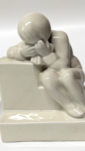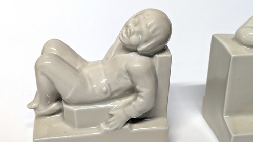 PAIRE DE SERRE-LIVRES en porcelaine émaillé blanc à décor de deux enfants assis. L'un riant, l'autre pleurant.